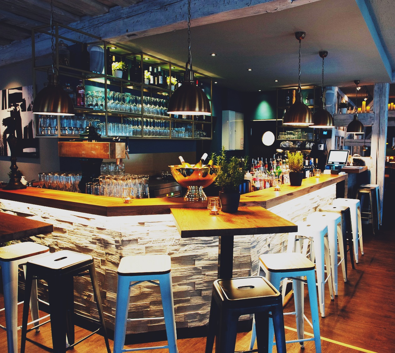 Die Gasträume wurden im gemütlichen, aber auch zeitgemäßem Interieur gestaltet, mit ausgefeiltem Lichtkonzept und viel Grünpflanzen-Elementen. Der große Biergarten sorgt mit seiner einzigartigen Lage, integriert in die historische Burgmauer-Anlage, für viel Frequenz im Sommer.